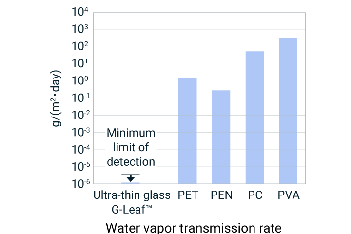 This hybrid material combines Ultra-thin Glass G-Leaf™ with resin film,offering the advantages of both materials. It features scratch resistance, excellent gas barrier properties, lightweight, and impact resistance. It can be used as a substitute for resin materials in areas where high gas barrier properties or dimensional stability are required.