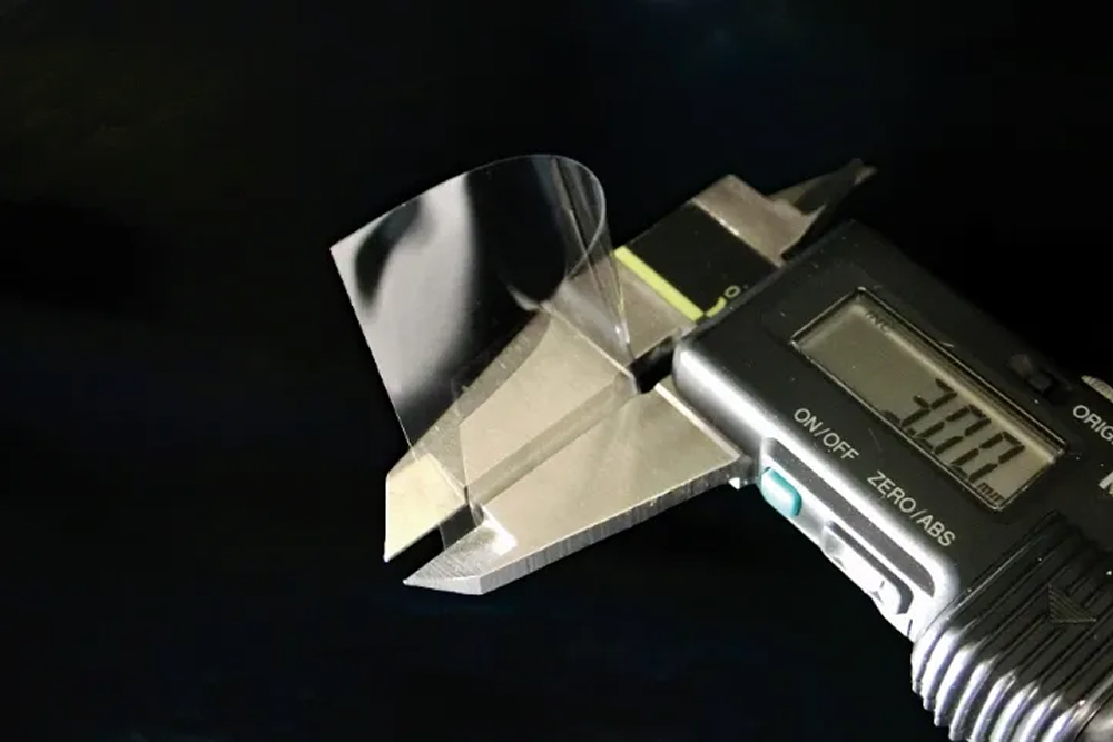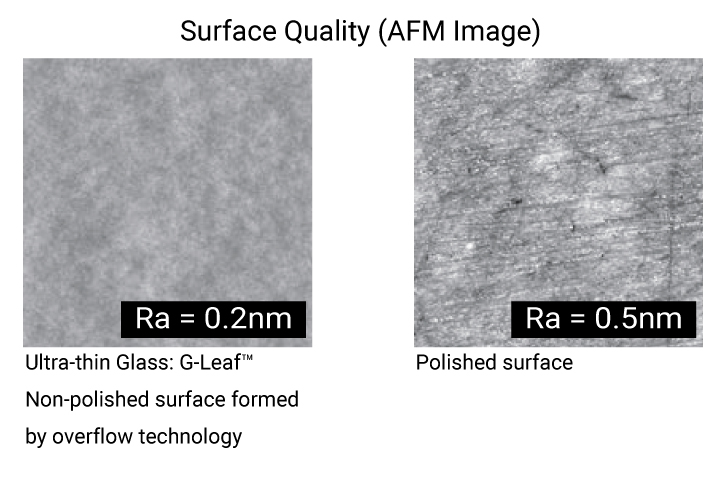 This glass has been developed for cover glass for foldable displays. It boasts excellent bending properties due to its high surface smoothness and uniform thickness, and can withstand bending with a diameter as small as 3mm (R1.5).