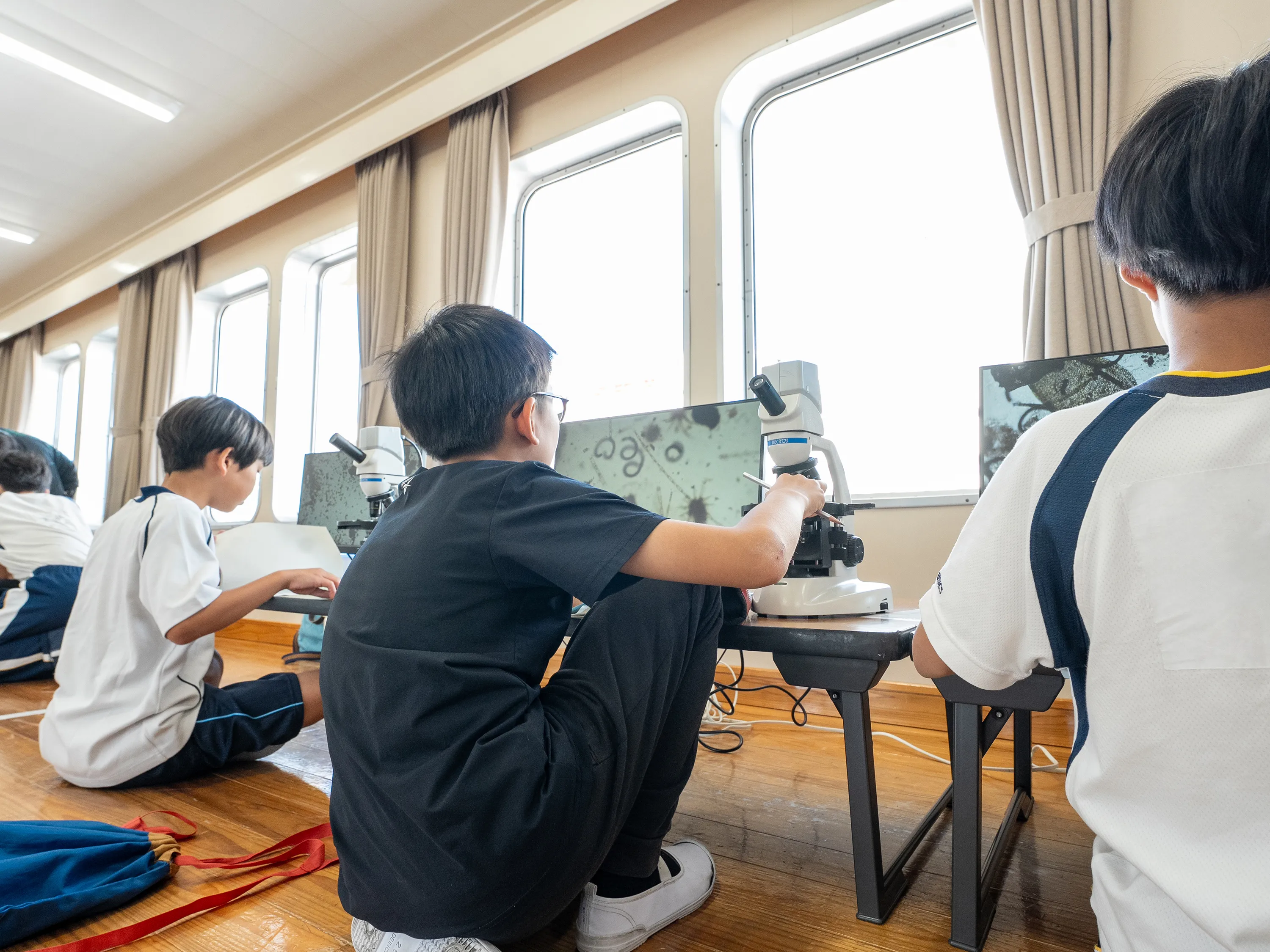 プランクトンや魚の観察では、顕微鏡を覗きながら「いっぱいいる!」「これは何だろう?」と声が上がります。「在来魚と外来魚は背びれの形が違う」といった発見も。