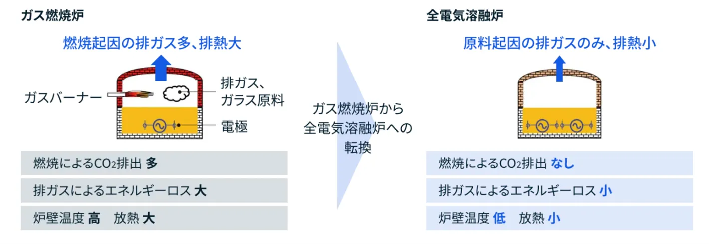現在、ガラス溶融は化石燃料を使用した燃焼による加熱が主流で、溶融時のCO₂排出が課題になっています。NEGの全電気溶融炉は、独自の電気溶融技術「NEG Electric Melting Technology(NEMT®)」を活用したもので、ガラスに電極を挿入して直接通電し加熱・溶融します。エネルギー利用効率に優れ、燃焼ガスによる排熱も減らすことができ、環境負荷の低減に大きく貢献します。